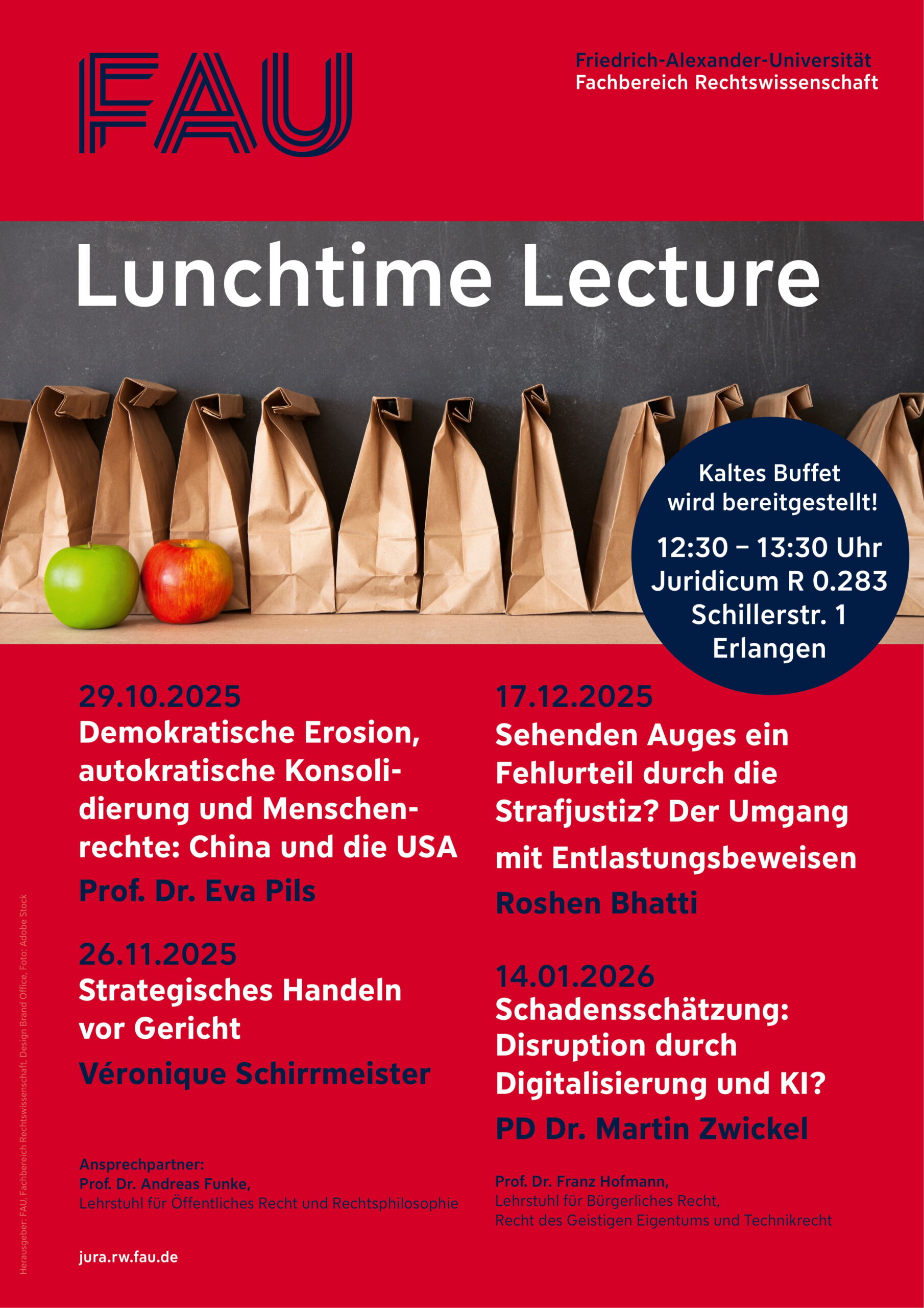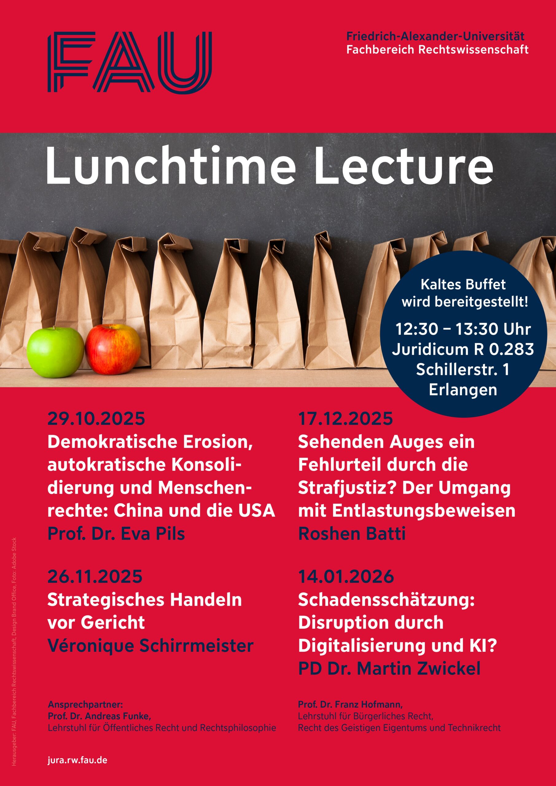 Auch in diesem Semester lädt der Fachbereich Rechtswissenschaften zu der Veranstaltungsreihe „Lunchtime Lecture“ ein. In entspannter Atmosphäre stellen die Mitglieder des Fachbereichs (Professor/-innen und Mitarbeiter/-innen) während der Mittagspause ausgewählte Themen und Fragen aus ihrer aktuellen Forschung vor. Die Veranstaltungsreihe soll ein Forum für den fachbereichsinternen Austausch bieten, bei dem neue Forschungsstände und Anregungen hierzu geteilt werden.
